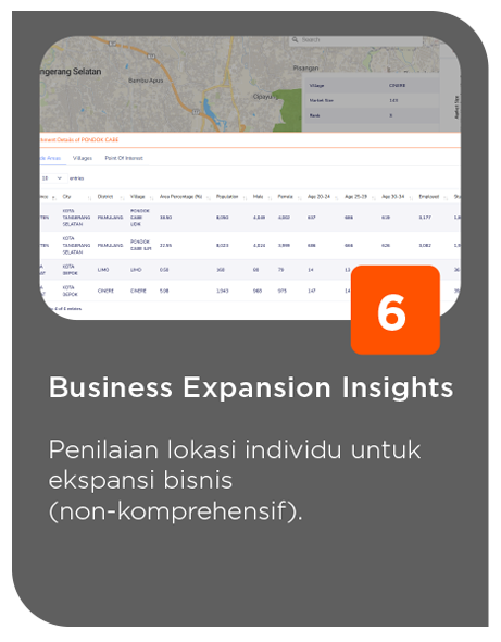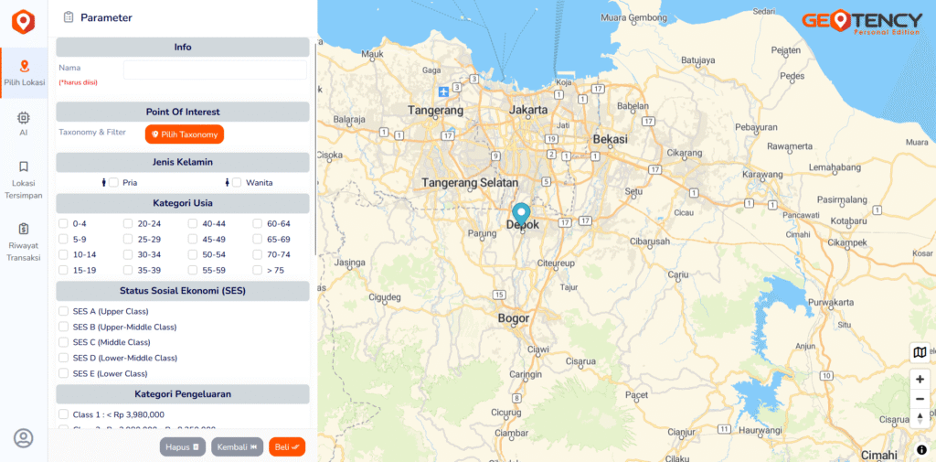 Dengan GeoTency Personal Edition, Anda dapat memilih parameter data yang benar-benar penting untuk kesuksesan bisnis. Mulai dari demografi, status ekonomi, expenditure classes, hingga market target kondisi lingkungan sekitar lokasi, semua bisa disesuaikan untuk membantu Anda membuat keputusan yang lebih tepat.