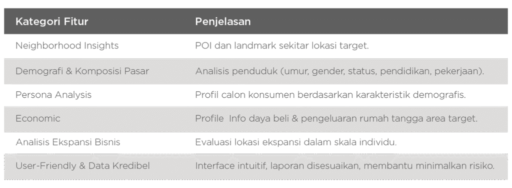 • Retail & F&B – Menentukan lokasi outlet/kios baru yang sejalan dengan target pasar.